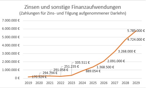 Anhand der Prognosen bis 2029 kann man im Haushaltsentwurf nachvollziehen, daß die Ausgaben für die Begleichung von Zinsen und sonstigen Finanzaufwendungen seit 2019 von 171.000 Euro auf 5,8 Mio Euro steigen werden (vgl. Bild Zinsen und sonstige Finanzaufwendungen).